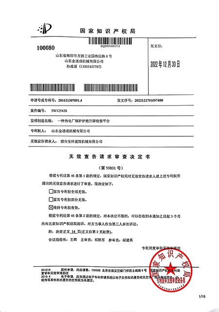 煙臺寶梓建筑機械有限公司抄襲的專利(專利號:201820409444.4),于2021年02月01日被國家知識產權局專利復審委員會宣告專利權全部無效。該公司惡意提起無效山東金道成機械有限公司有關專利的申請,經過國家知識產權局專利復審委員會的有關審查程序,根據《專利法》第46條第1款的規定,于2022年12月30日對我公司兩項專利做出宣告專利權全部有效的審查決定。